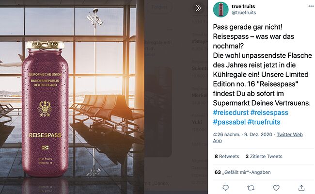 TrueFruits wäre nicht TrueFruits, wenn sie nicht mit einer fehlgeplanten Sonder-Edition gewohnt unkonventionell umgehen würden. Die Limited Edition „Reisepass“ war bereits vor Corona in Planung. Doch zum Release hat TrueFruits den denkbar unpassendsten Moment erwischt: den zweiten harten Lockdown. An Reisen ist momentan nicht zu denken. Doch TrueFruits attestiert sich einfach selbst den „Marketing-Fail des Jahres“ und bringt die Limited Edition no. 16 trotzdem raus. „Die wohl unpassendste Flasche des Jahres reist jetzt in die Kühlregale ein“, heißt es auf dem Twitter-Account der Marke mit den gerne mal provozierenden Sprüchen auf der Flasche.